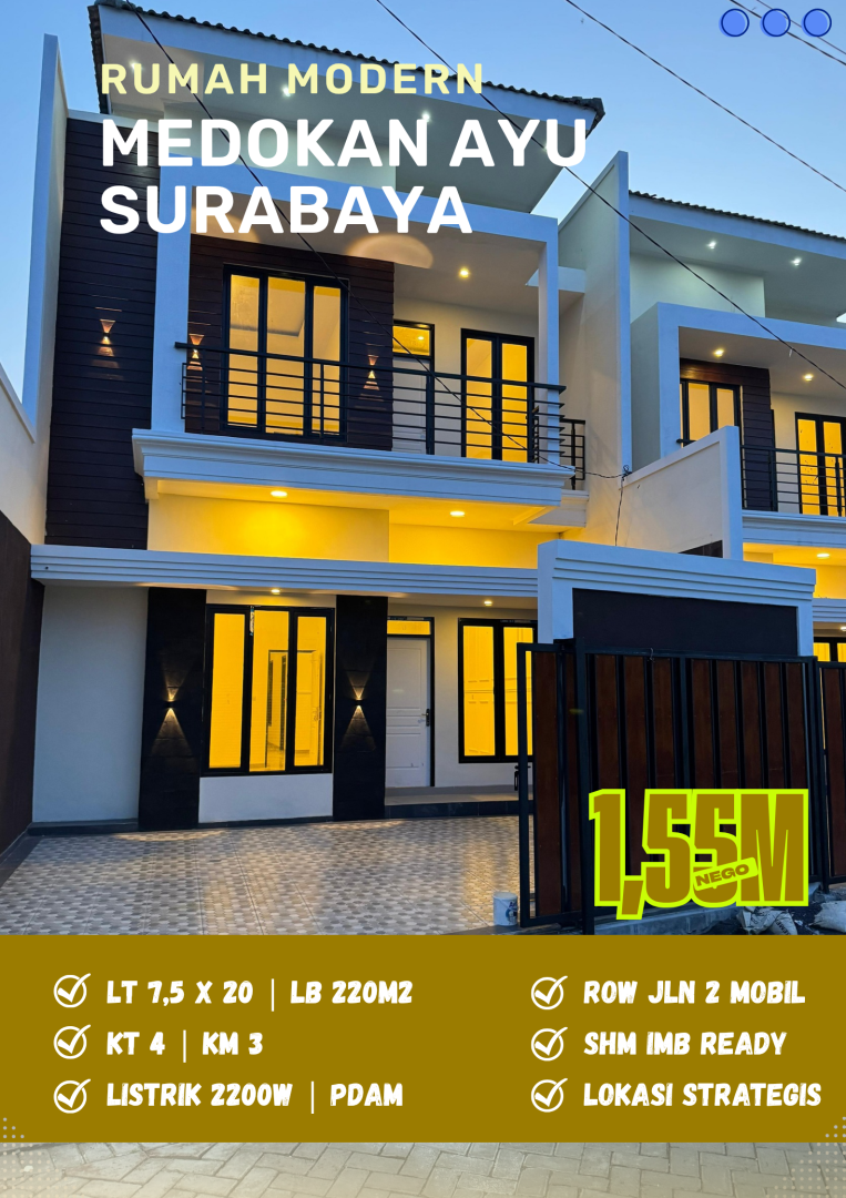 Rumah keluarga di lokasi strategis Medokan Ayu, Surabaya. Dengan 4 KT dan 3 KM, LT 150m², LB 220m². Harga terbaik 1,55 Miliar. Dekat fasilitas publik.
