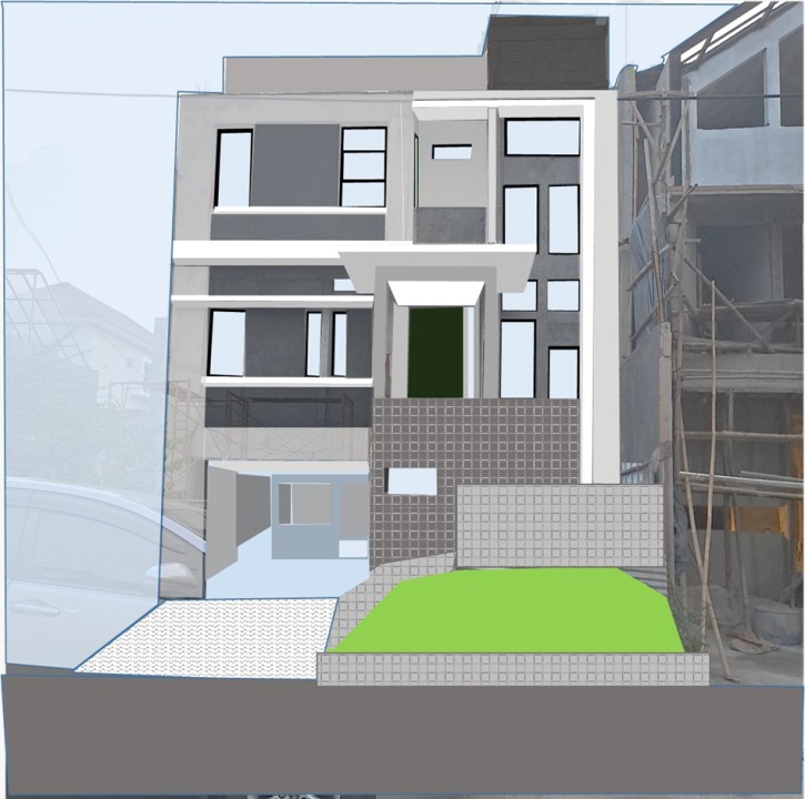Lantai 2: kamar tidur 1 + KM dalam (4 × 3.75 m), ruang keluarga + dining room + pantry (4 × 8 m), toilet tamu