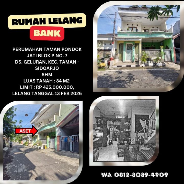 JUAL RUMAH LELANG SIDOARJO (TAMAN PONDOK JATI - GELURAN TAMAN) - LELANG KPKNL