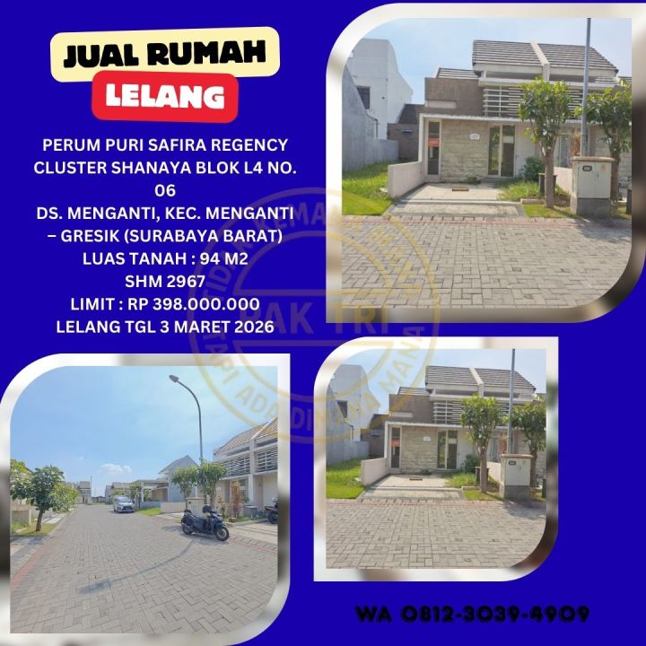 Jual Rumah Lelang Bank di Menganti (Puri Safira Regency Cluster Shanaya) : Lelang Kpknl