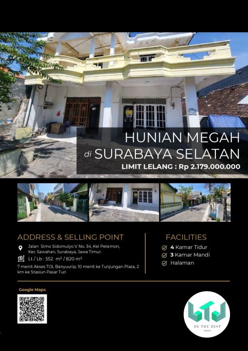 Rumah minimalis di kawasan Surabaya Kota, Surabaya. Luas tanah 552m² dan luas bangunan 820m², dilengkapi 4 KT & 3 KM. Harga mulai 2,17 Miliar. Proses cepat.