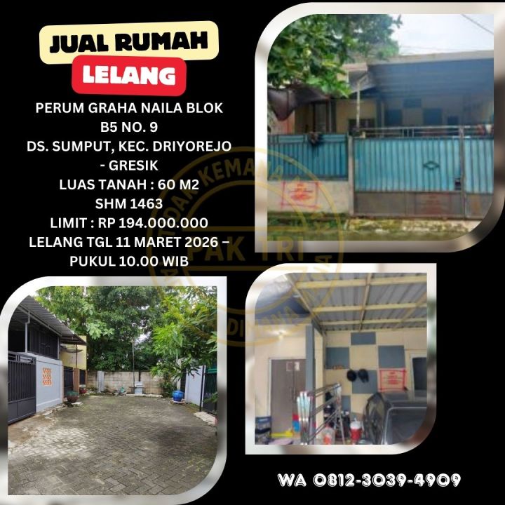 JUAL RUMAH LELANG BANK DI DRIYOREJO GRESIK (PERUMAHAN GRAHA NAILA) - LELANG KPKNL