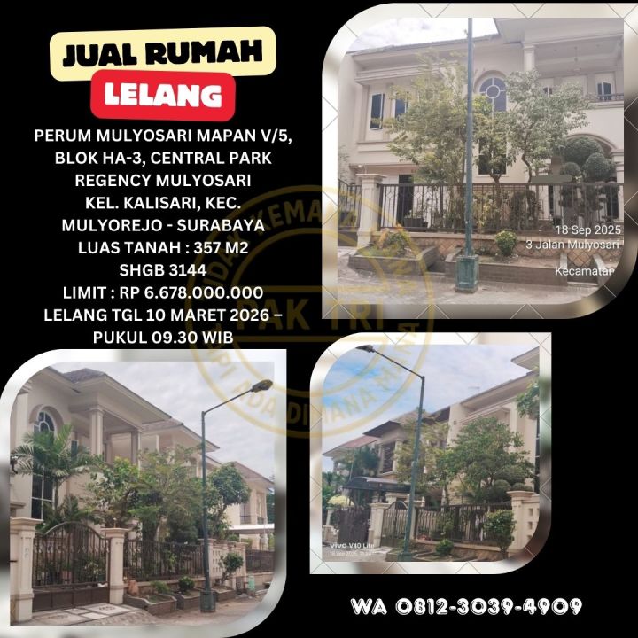 JUAL RUMAH LELANG BANK DI MULYOREJO SURABAYA (MULYOSARI MAPAN) - LELANG KPKNL