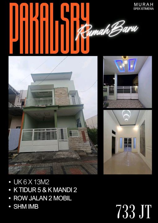 Rumah keluarga di lokasi strategis Pakal, Surabaya. Punya 5 KT dan 2 KM, LT 78m², LB 156m². Harga terbaik 733 Juta. Dekat fasilitas umum.