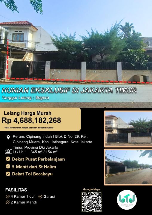 Penawaran istimewa memiliki rumah elit di Jatinegara, Jakarta Timur. Luas tanah 345m², bangunan 154m², 4 KT & 2 KM. Harga terbaik di kelasnya: 4,68 Miliar. Dekat pusat kota dan fasilitas premium.