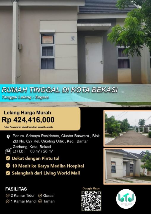 Rumah minimalis harga ekonomis di kawasan Bekasi Kota, Bekasi. Memiliki 2 kamar tidur dan 1 kamar mandi. Luas tanah 60m² dan bangunan 28m². Bisa KPR, harga 424 Juta.
