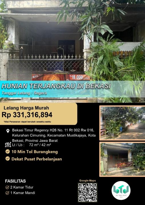 Rumah murah area Bekasi Kota, Bekasi. Memiliki luas tanah 72m², luas bangunan 42m², dilengkapi 2 KT & 1 KM. Harga terjangkau hanya 331 Juta. Lingkungan nyaman.