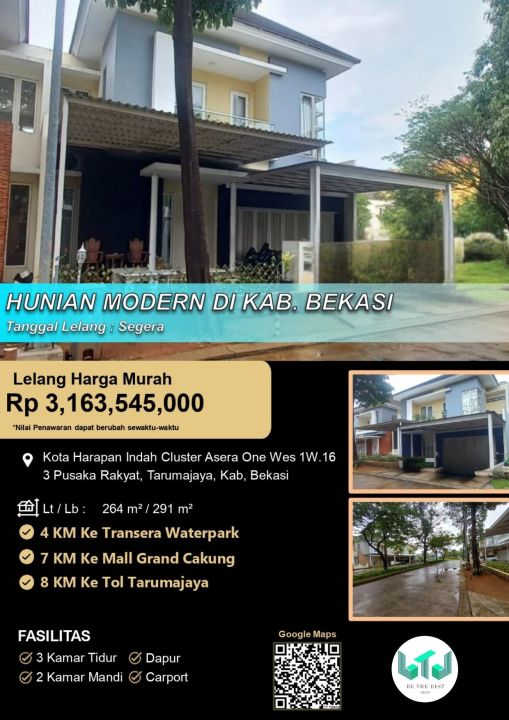 Tersedia rumah eksklusif di kawasan elit Tarumajaya, Bekasi. Dengan desain elegan, LT 264m², LB 291m², terdiri dari 3 KT & 2 KM. Harga premium: 3,16 Miliar. Lingkungan prestisius.