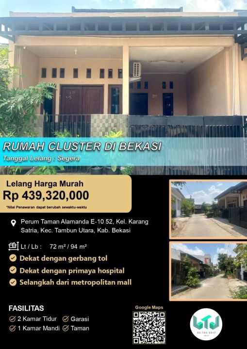 Rumah minimalis area Tambun Utara, Bekasi. Memiliki luas tanah 72m², luas bangunan 94m², dilengkapi 2 KT & 1 KM. Harga terjangkau hanya 439 Juta. Dekat fasilitas umum.