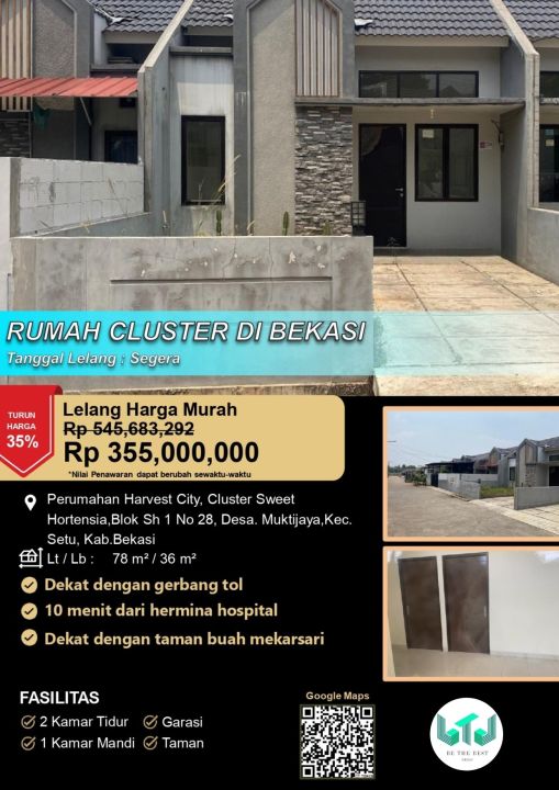 Rumah murah area Setu, Bekasi. Memiliki luas tanah 78m², luas bangunan 36m², dilengkapi 2 KT & 1 KM. Harga terjangkau hanya 355 Juta. Lingkungan nyaman.