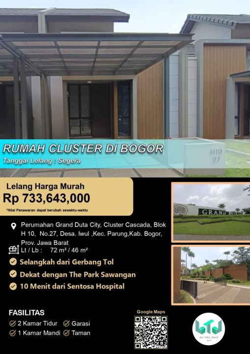 Promo terbatas rumah idaman di Parung, Bogor. Luas tanah 72m² dengan bangunan 46m², terdiri dari 2 KT & 1 KM. Harga kompetitif di kelasnya: 733 Juta. Lingkungan asri dan aman.