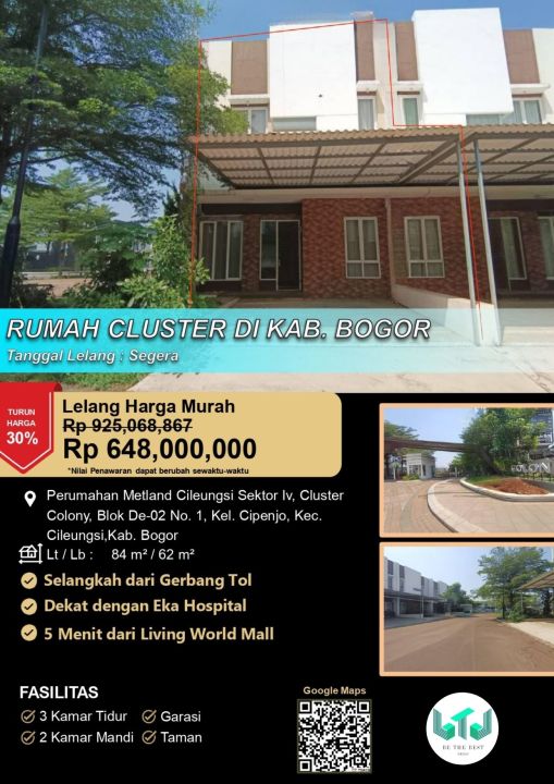 Rumah nyaman di lokasi strategis Cileungsi, Bogor. Punya 3 KT dan 2 KM, LT 84m², LB 62m². Harga terbaik 648 Juta. Dekat fasilitas umum.