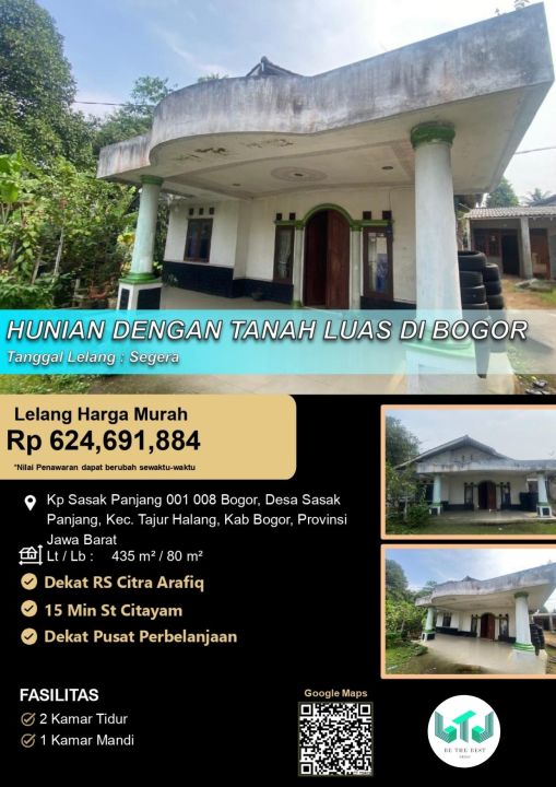 Penawaran menarik rumah di Tajur Halang, Bogor. Memiliki 2 kamar tidur, 1 kamar mandi, luas tanah 435m², luas bangunan 80m². Harga spesial: 624 Juta. Lingkungan aman.