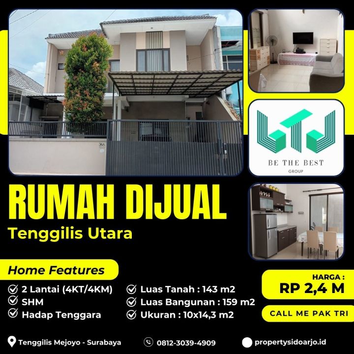 Rumah nyaman di lokasi strategis Tenggilis Mejoyo, Surabaya. Dengan 4 KT dan 4 KM, LT 143m², LB 159m². Harga terbaik 2,4 Miliar. Dekat fasilitas publik.