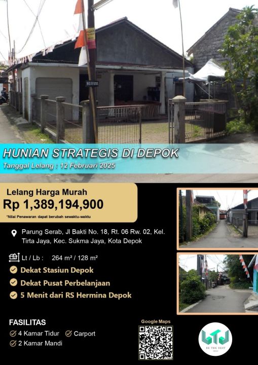 Segera miliki rumah idaman di Sukmajaya, Depok. Luas tanah 264m² dengan bangunan 128m², terdiri dari 4 KT & 2 KM. Harga kompetitif di kelasnya: 1,38 Miliar. Lingkungan asri dan aman.