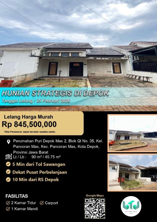 Rumah nyaman di lokasi strategis Pancoran Mas, Depok. Punya 2 KT dan 1 KM, LT 90m², LB 45m². Harga terbaik 845 Juta. Dekat fasilitas umum.