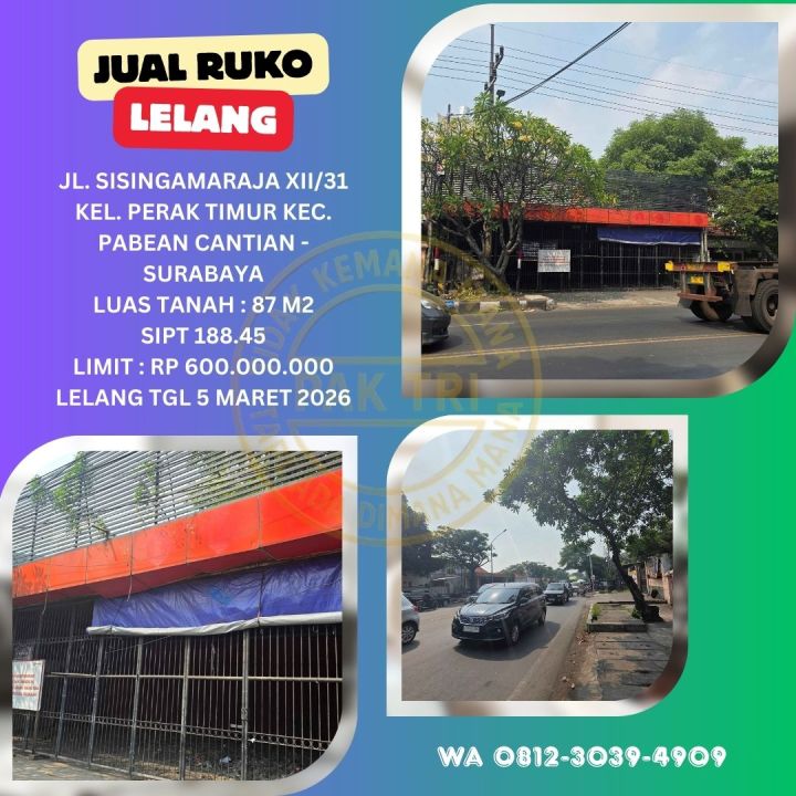 JUAL RUKO LELANG BANK DI SURABAYA (JL. SISINGAMARAJA - PERAK TIMUR) : LELANG KPKNL
