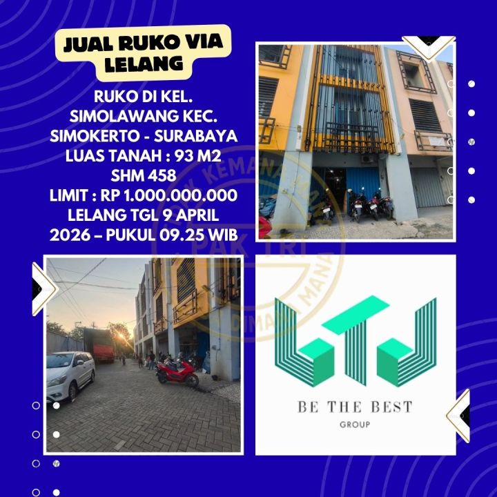DIJUAL RUKO VIA LELANG DI SIMOKERTO SURABAYA (KEL. SIMOLAWANG) - LELANG KPKNL