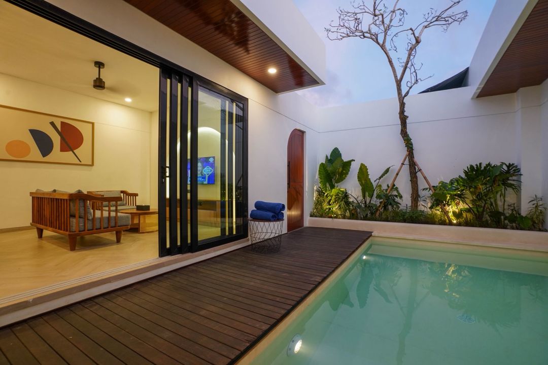 *TAVA Villas & Suites* di Jimbaran menawarkan villa mewah dengan desain Modern Mediterranean Tropical. Salah satu pilihan yang tersedia adalah 2 Bedroom Pool Villa dengan luas 140/126 sqm, yang ideal untuk keluarga atau pasangan.